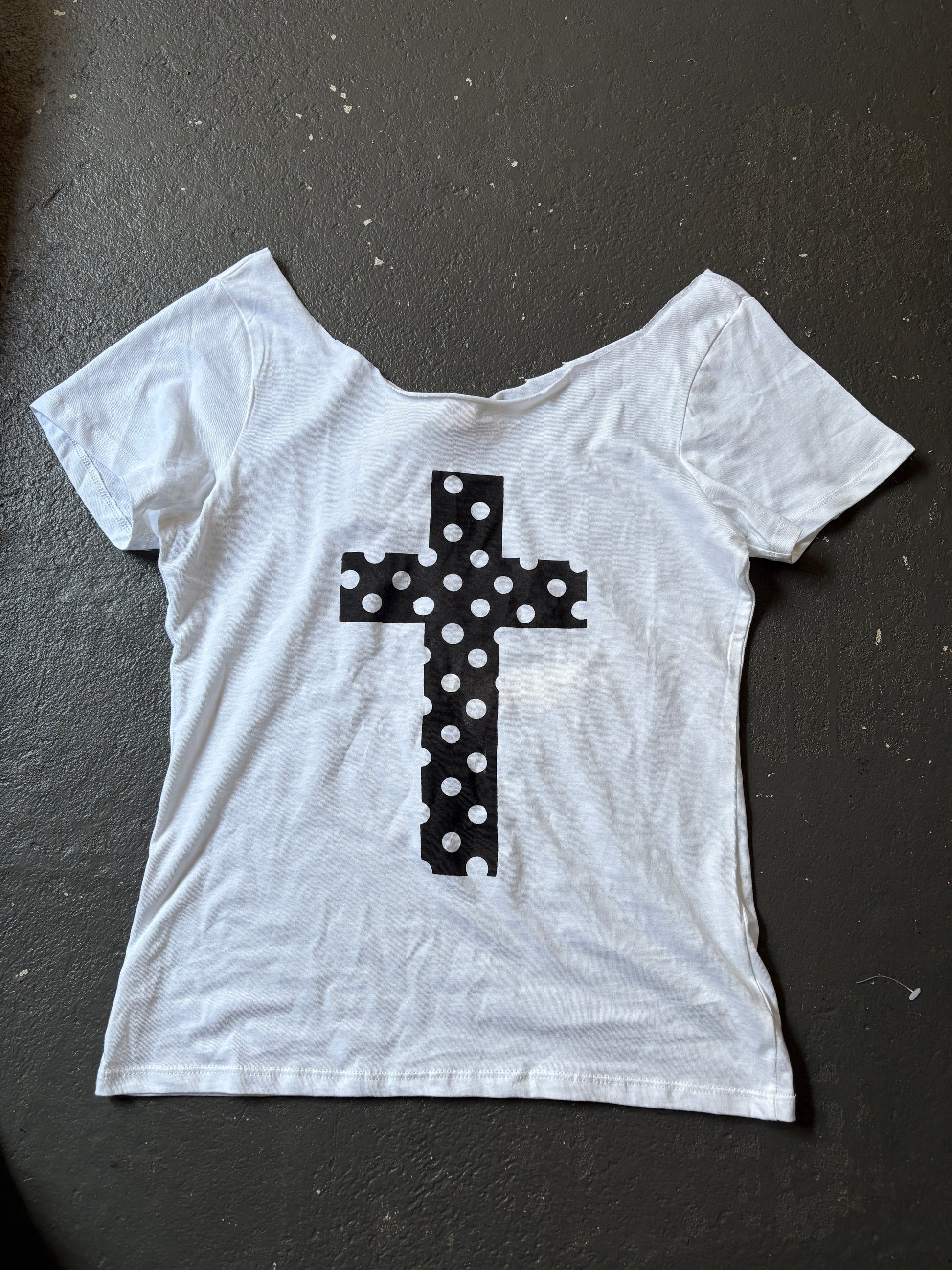 Features an off the shoulder style tee, with a screen printed polka dot cross!